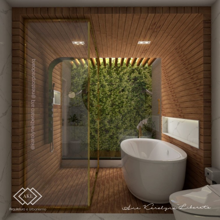Para esse projeto, os clientes pediram um espaço contemplativo, confortável, bonito, agradável, aconchegante, relaxante, uma espécie de SPA. Por isso, incluímos em nossa proposta um jardim de inverno e uma banheira. Esse é o tipo de ambiente que te faz contar os minutos para voltar para casa depois de um dia cansativo e difícil, é o tipo de ambiente que te permite desconectar do mundo e dos problemas e relaxar, ter um momento só seu, um momento de autocuidado.