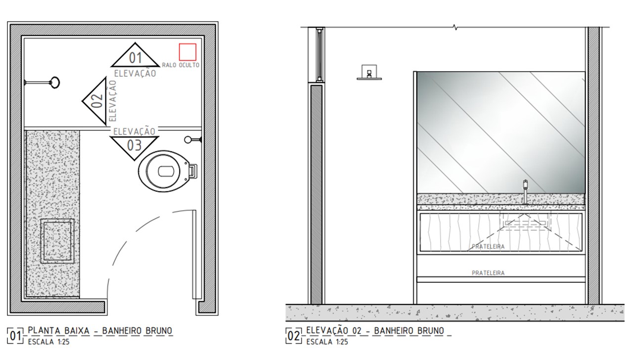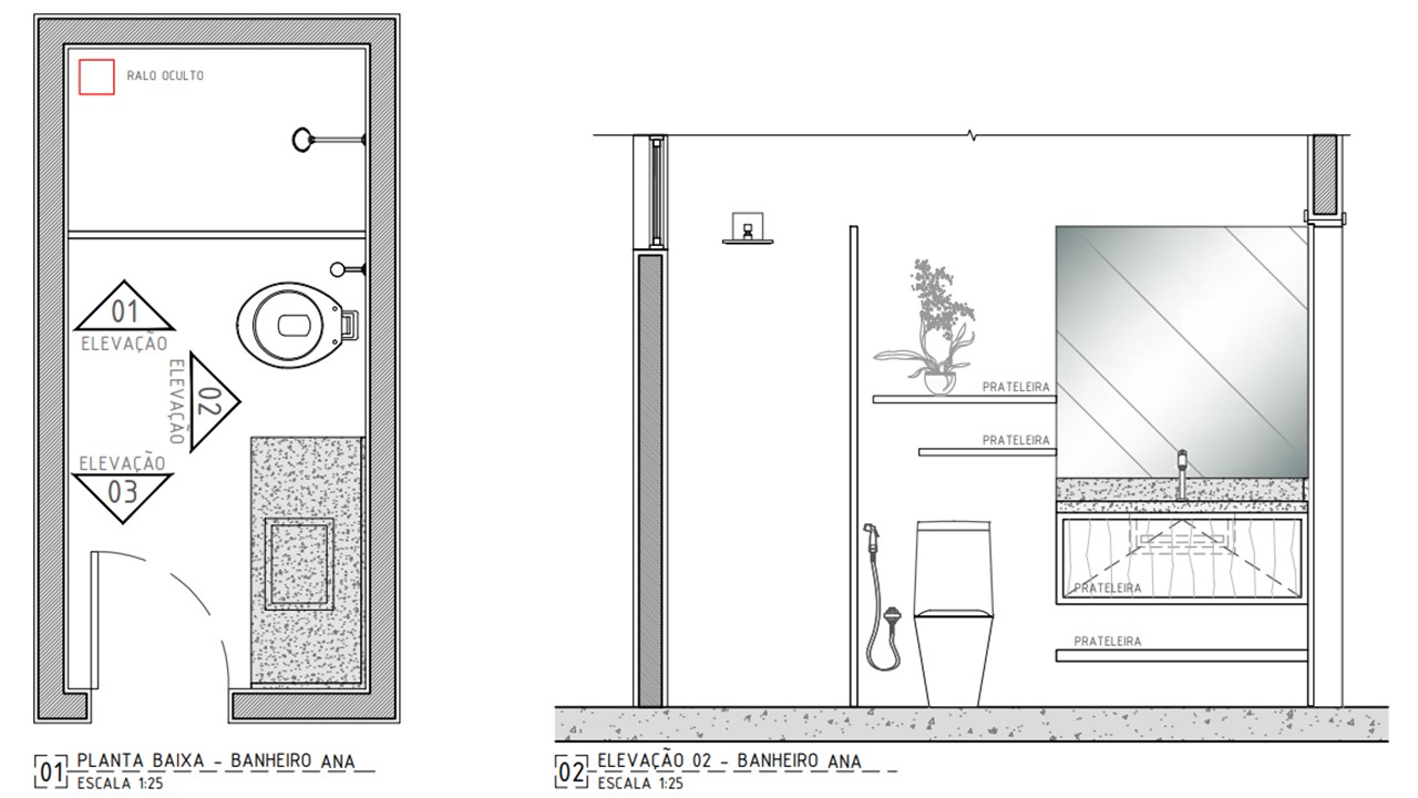 Esse desenho técnico foi feito para o banheiro da Ana, uma jovem organizada, que ama o estilo minimalista e que gosta de plantas no banheiro. A prioridade dela era um ambiente bonito e que conseguisse fazer a limpeza e manter organizado sem dificuldades. Ela é o tipo de pessoa que não gosta de armazenar muitas coisas no banheiro, prefere armazenar no quarto, por isso não queria gavetas, apenas espaço de armário para colocar roupas sujas e alguns itens de higiene.